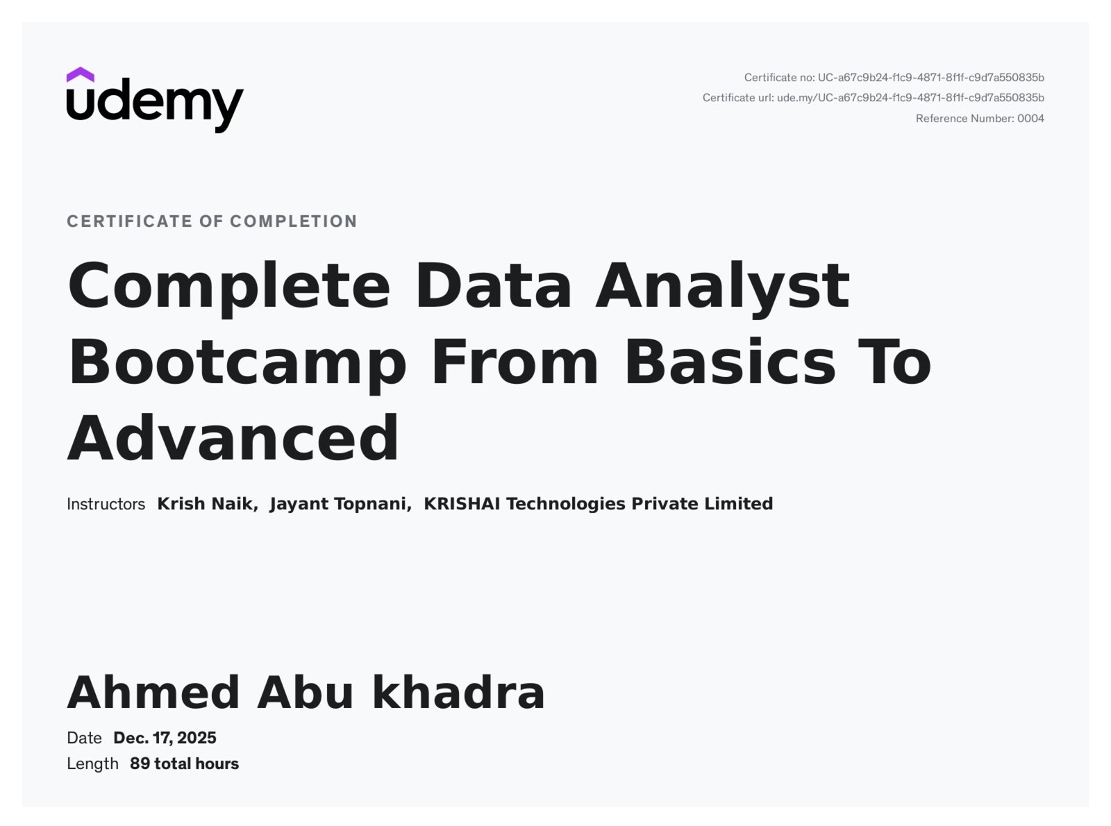 Completed a full-spectrum data analytics bootcamp covering statistics, Excel analytics, SQL querying, Python programming, and practical business case studies. Gained hands-on experience preparing datasets, building analytical models, and developing insight-driven solutions aligned with real industry workflows. Demonstrated strong technical foundations and the ability to translate raw data into clear, actionable business outcomes