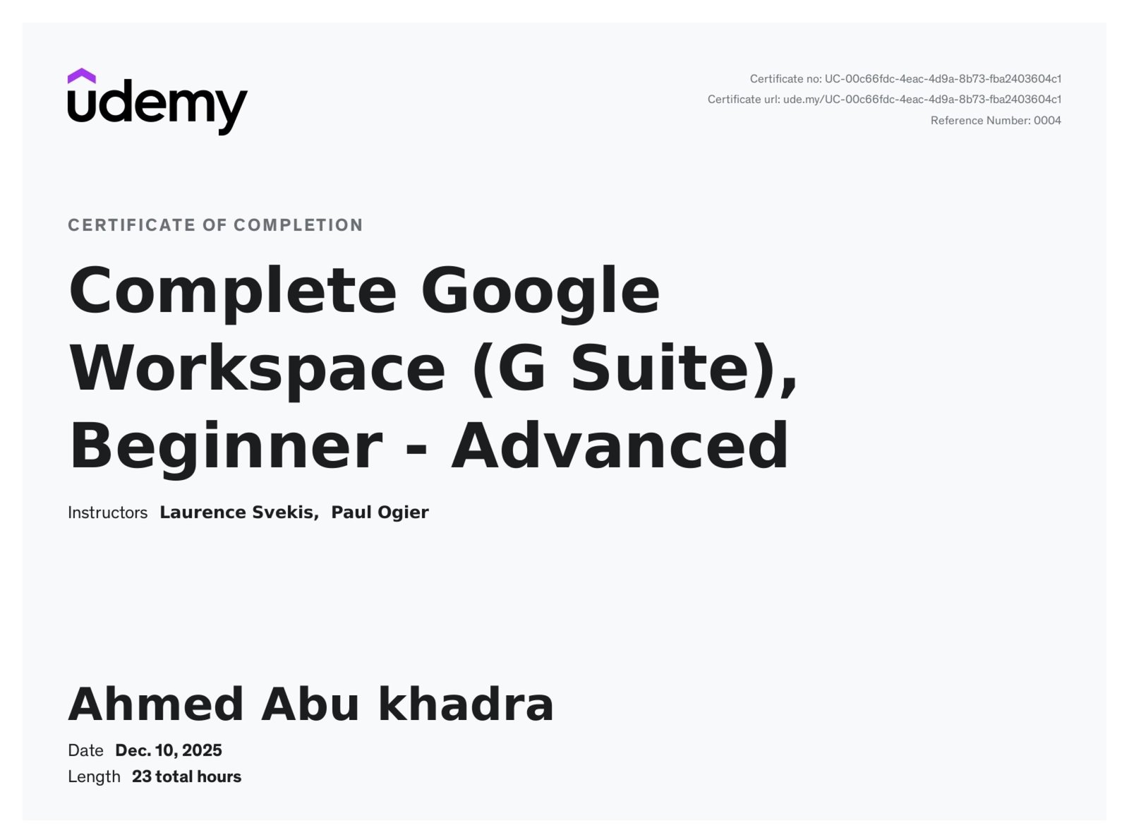ompleted an end-to-end Google Workspace program covering Gmail management, Google Docs collaboration, Sheets automation, Slides presentation design, Drive organization, and Calendar scheduling. Gained advanced skills in creating shared workflows, building structured documents, analyzing data in Sheets, and optimizing productivity across cloud-based environments. Developed practical, job-ready capabilities for modern digital communication and team collaboration.