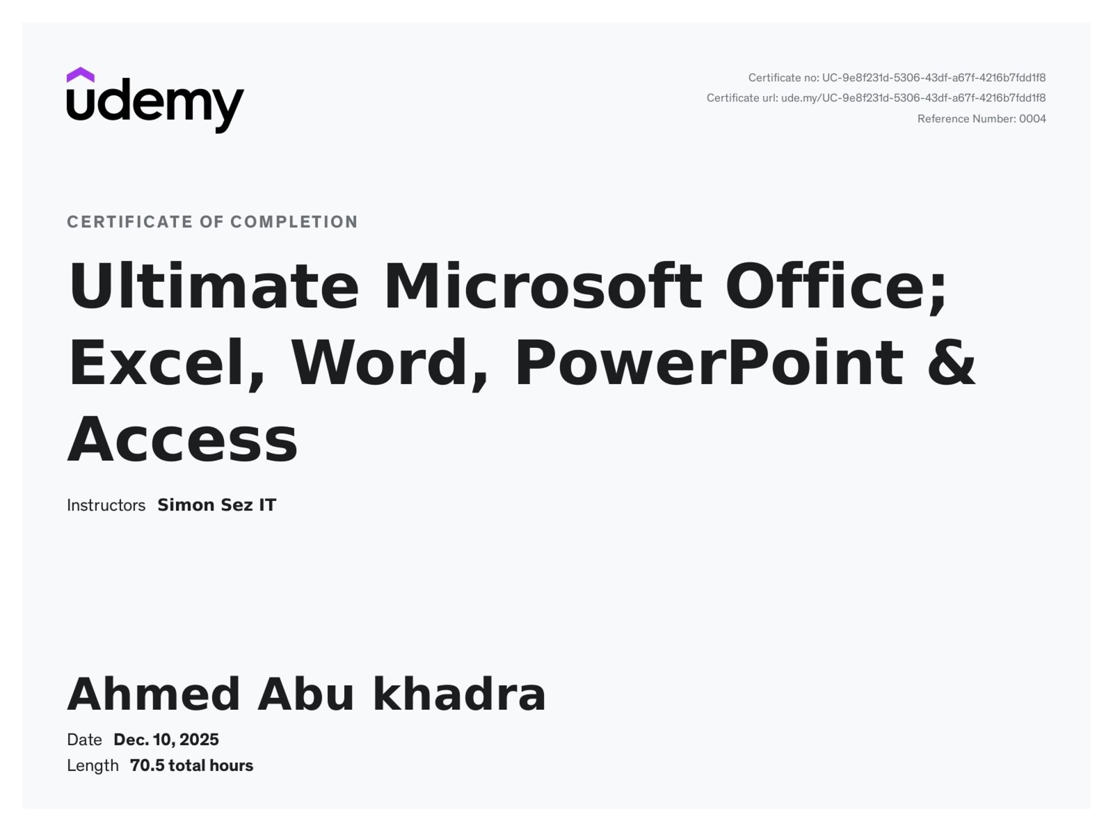 Completed a comprehensive Microsoft Office program covering Excel analytics, Word documentation, PowerPoint presentation design, and Access database management. Gained practical skills in building structured reports, creating dynamic spreadsheets, designing business-ready presentations, and organizing data using relational databases. Strengthened foundational tools essential for professional communication, data organization, and efficient workflow execution across business environments