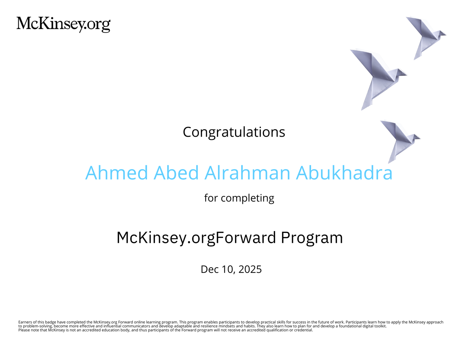 Completed McKinsey’s Forward Program, an internationally recognized professional development track focused on structured problem-solving, digital productivity, leadership communication, and strategic thinking. Trained on the McKinsey approach to breaking down complex challenges, delivering high-impact insights, and operating with an adaptive, resilient mindset. Earned a globally respected certificate demonstrating strong professional capability and readiness for modern, dynamic workplaces
