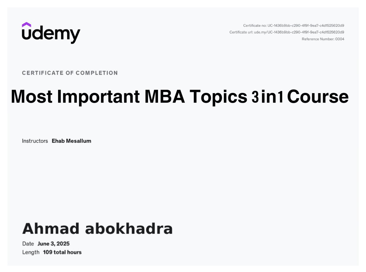 Completed an intensive 109-hour program covering core business management, strategic marketing, consumer behavior, sales mastery, branding, customer experience, and modern marketing operations. Developed a deep understanding of how businesses function, how strategies are built, and how decisions drive organizational growth. Achieved a professional-level certification demonstrating strong business acumen and practical managerial skills